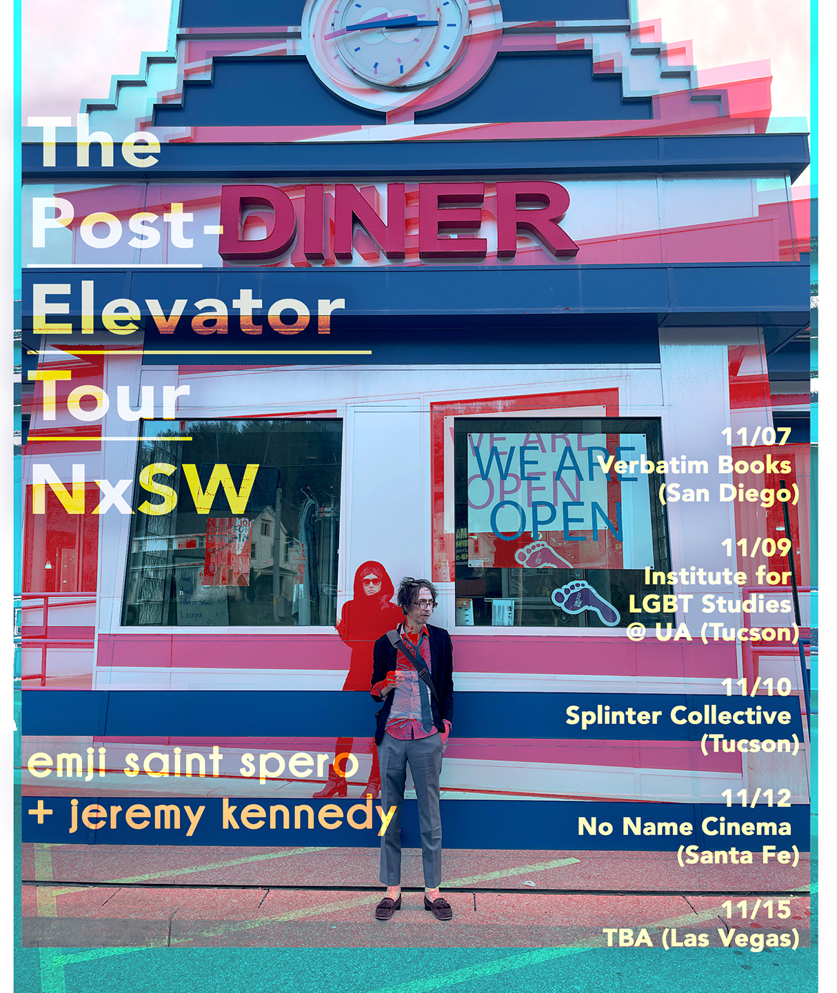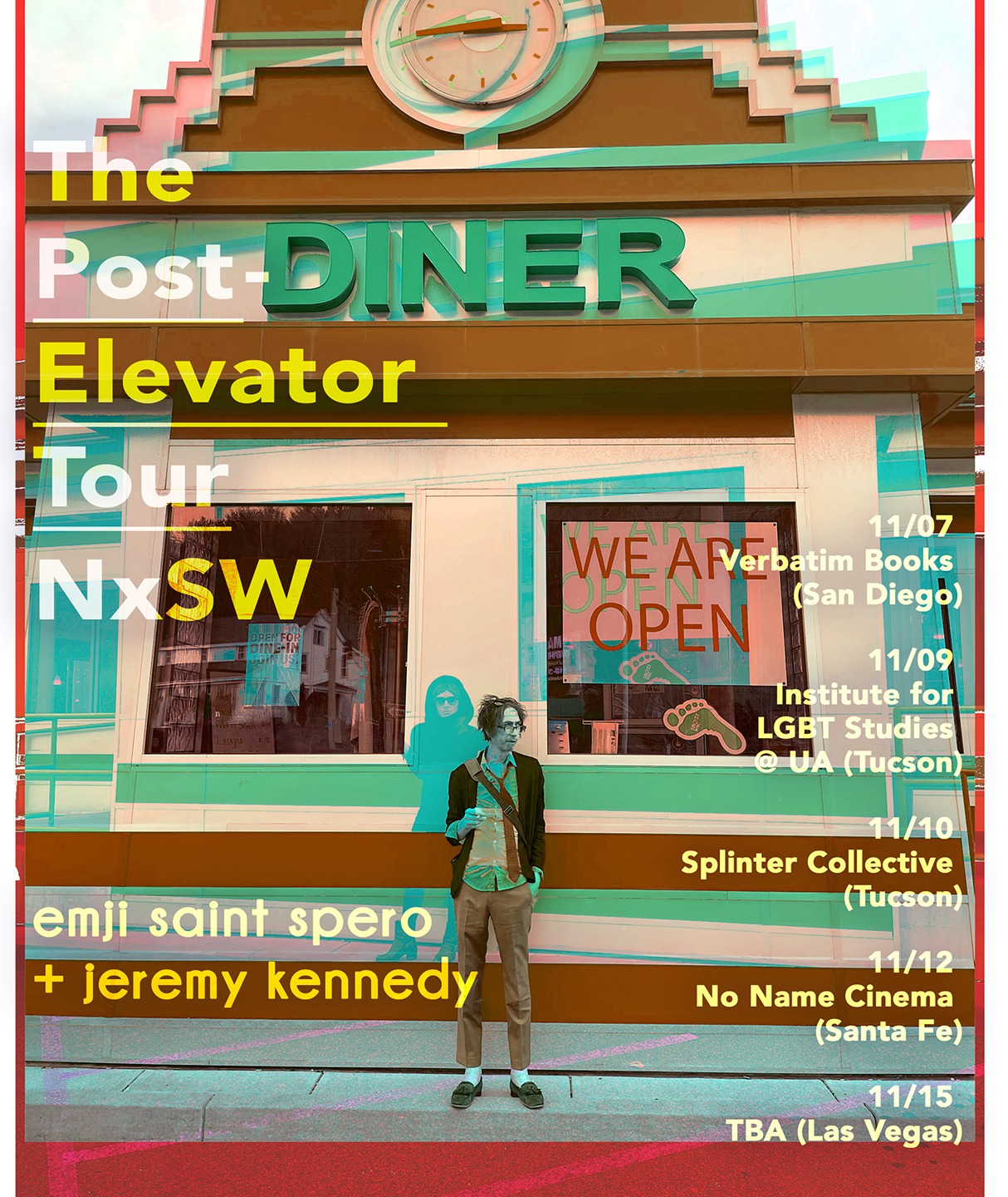 Designed by Jeremy Kennedy and Emji Saint Spero for The Post-Elevator Tour NxSW, 2022. Printed by Justin Clifford Rhody at Frontier Fine Art Printing, Santa Fe, with support from an Emergency Grant from The Foundation for Contemporary Arts.