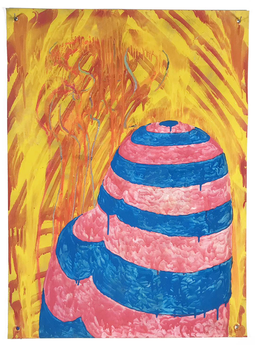 Intervals is a selection of work by Lou Joseph produced since the birth of his son Gabe in 2017. Using recycled vinyl cut to 26 x 36 inch pieces, the artist worked on batches of paintings in his home studio, the process of working on the paintings in layers fit into the times in between child care, family time, employment and housework. This at times erratic process was only exacerbated by the ongoing pandemic and working from home. While not a literal, day-by-day documentation of this time, the accumulated works (this exhibition includes 35 of 150 paintings) relay a sense of the fun, lack of sleep, mental health struggles, worry over the pandemic/the united states/climate change/etc and personal growth during this time.